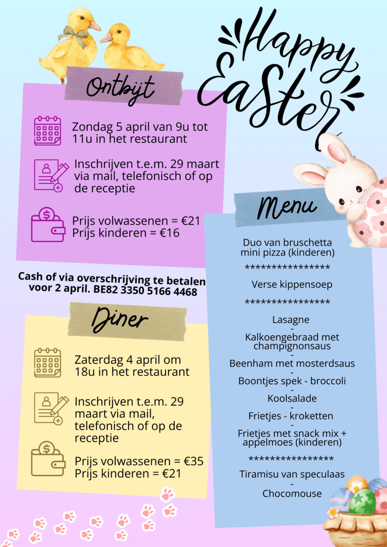 Vanaf 18u is het paasdiner in ons restaurant. Het menu vindt u hieronder. Schrijf u in vóór 29 maart via e-mail, telefonisch of aan de receptie.